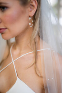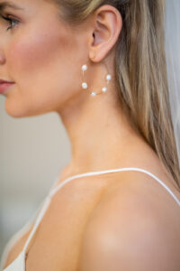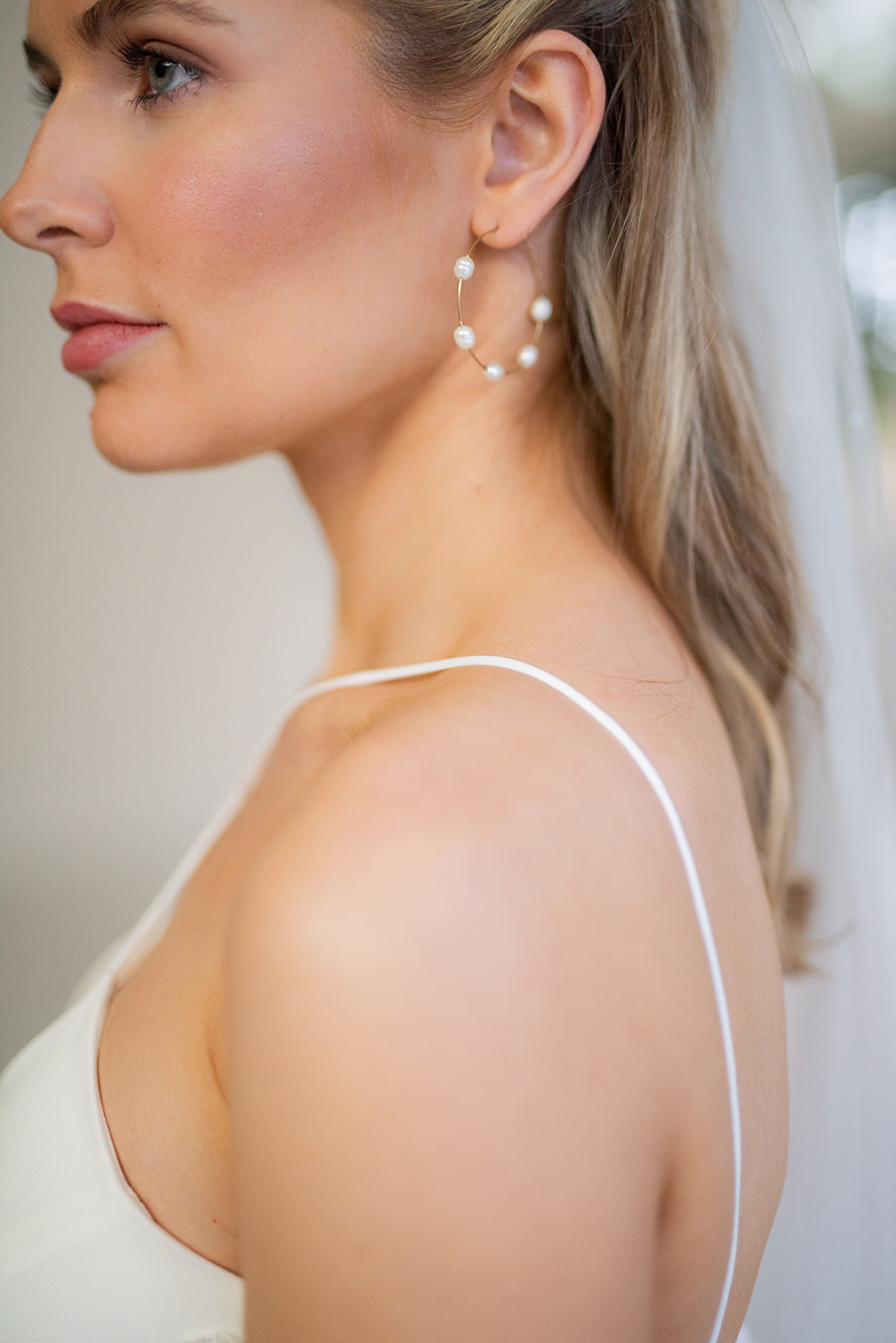 Die filigranen Ohrhänger Violet bestehen aus zarten goldenen Creolen mit kleinen Perlen in ivory – die perfekte Ergänzung zu Brautkleidern und Zweiteilern im modern classy Style.