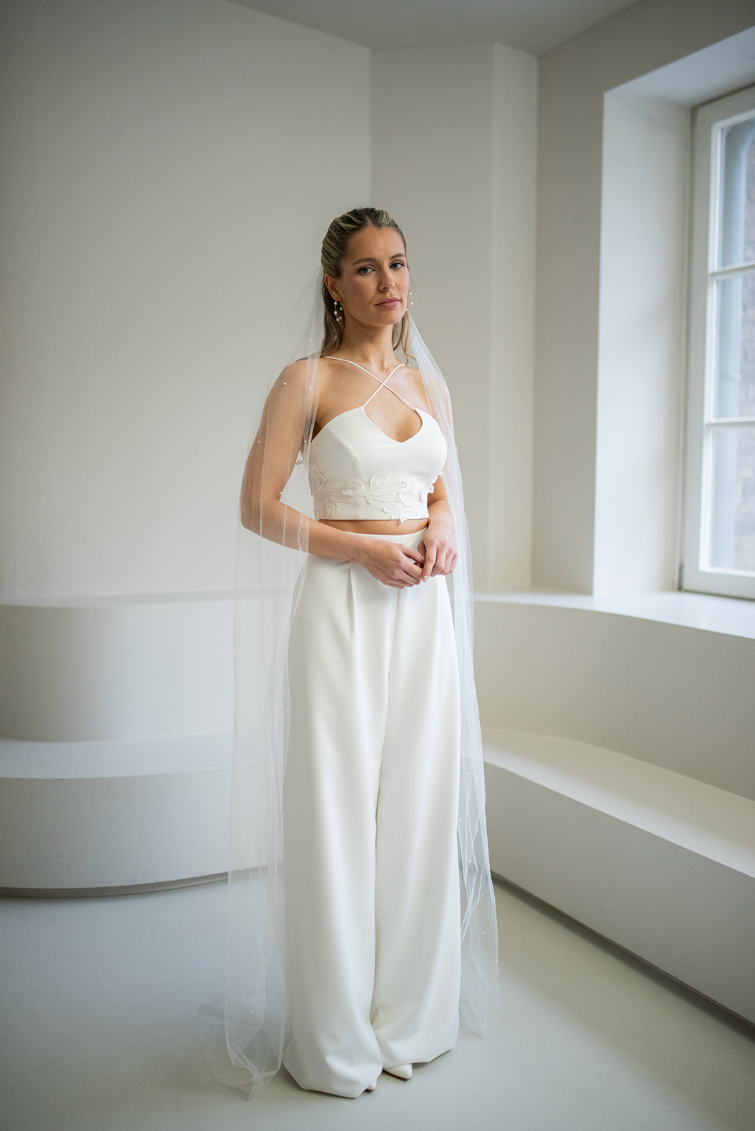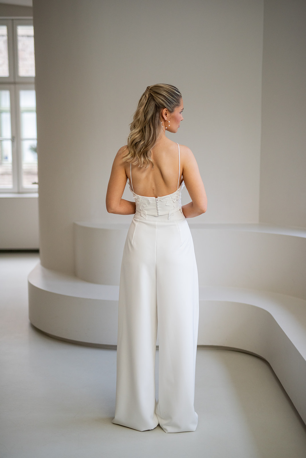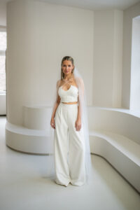Unsere stylische und zugleich elegante Brauthose laurence aus Crepe zaubert einen modernen Look für deine Hochzeit! Die ivory farbene Brauthose ist mit mit kleinen Falten im Vorderteil versehen – für einen lässig-eleganten Fall. Mit dieser Brauthose kannst du stundenlang unbeschwert tanzen auf deiner Hochzeitsparty! Unsere Brauthose Laurence passt perfekt zu den verschiedensten Brauttops wie beispielsweise unserem Topper Sally oder dem Brautoberteil Virginie.