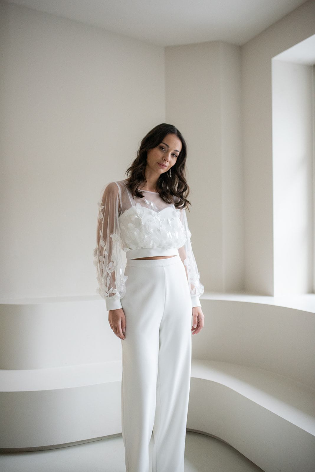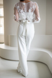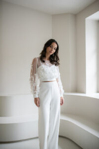 Unsere stylische und zugleich elegante Brauthose Lesly aus Crepe zaubert einen modernen Look für deine Hochzeit! Die ivory farbene Brauthose ist mit einem lässig weiten Schnitt versehen – für einen wunderschönen Fall. Mit dieser Brauthose kannst du stundenlang unbeschwert tanzen auf deiner Hochzeitsparty! Unsere Brauthose Lesly passt perfekt zu den verschiedensten Brauttops wie beispielsweise unserem Topper Sally oder dem Brautoberteil Virginie.