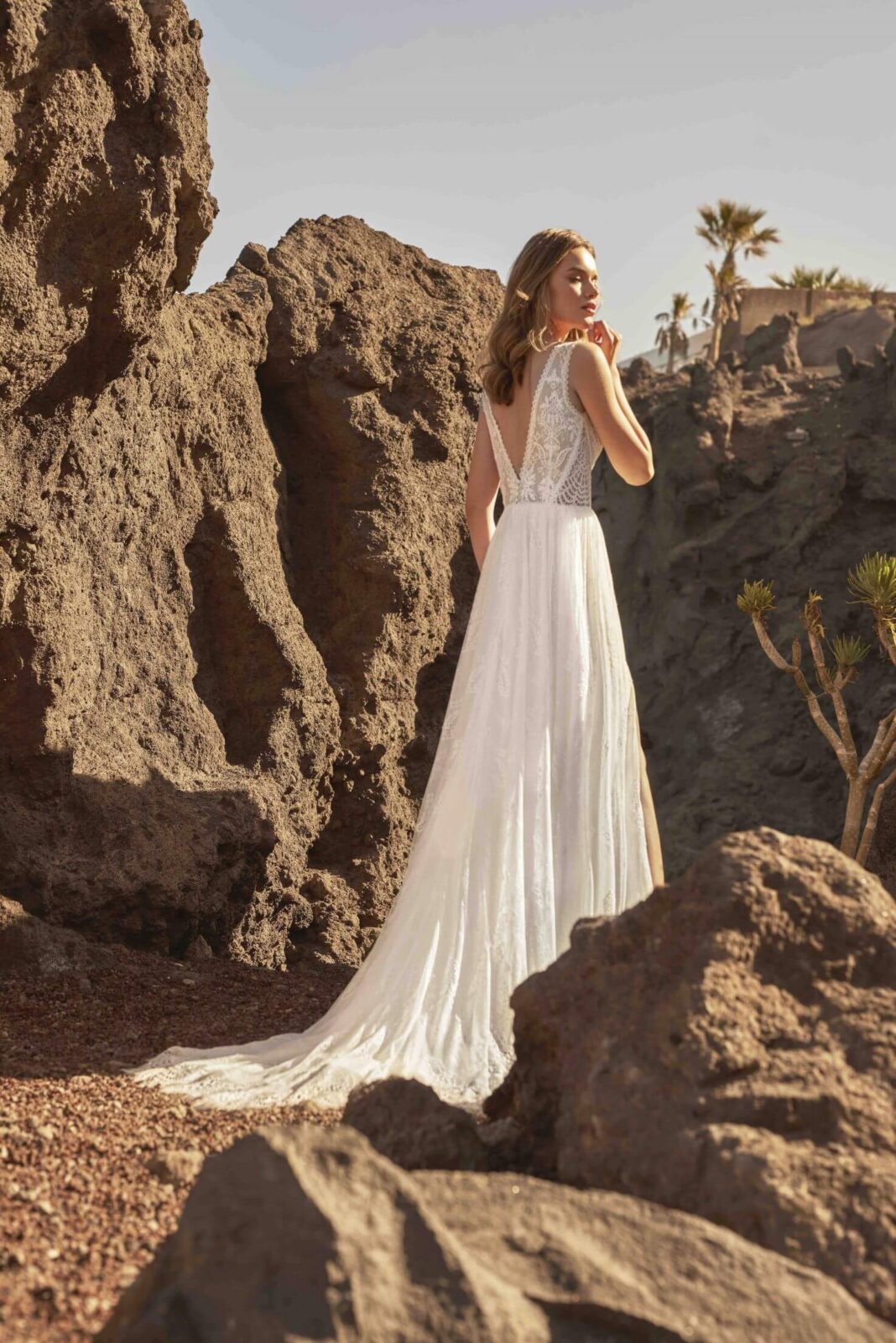 Sample Sale – Bodenlanges Brautkleid Amarilla des Labels Eliana Kresa komplett aus Spitze mit V-Ausschnitt, tiefem Rückenausschnitt und Beinschlitz. Ein absoluter Hingucker für deine Hochzeit!