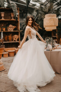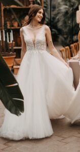 Sample Sale – Bodenlanges Brautkleid Anastasia besteht im Oberteil aus zarter Spitze und hat einen aufregenden Tüllrock. Ein absoluter Hingucker für deine Hochzeit!