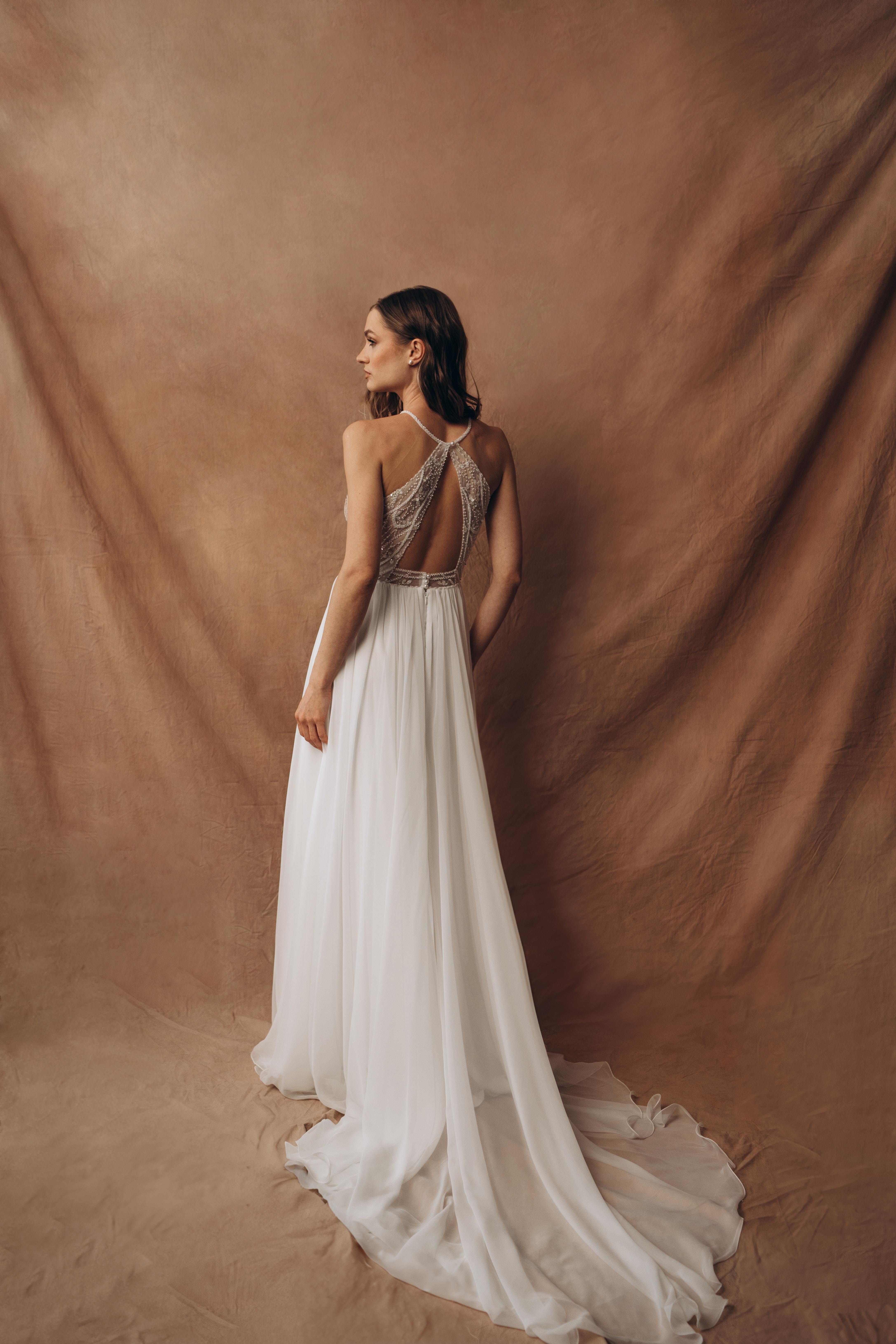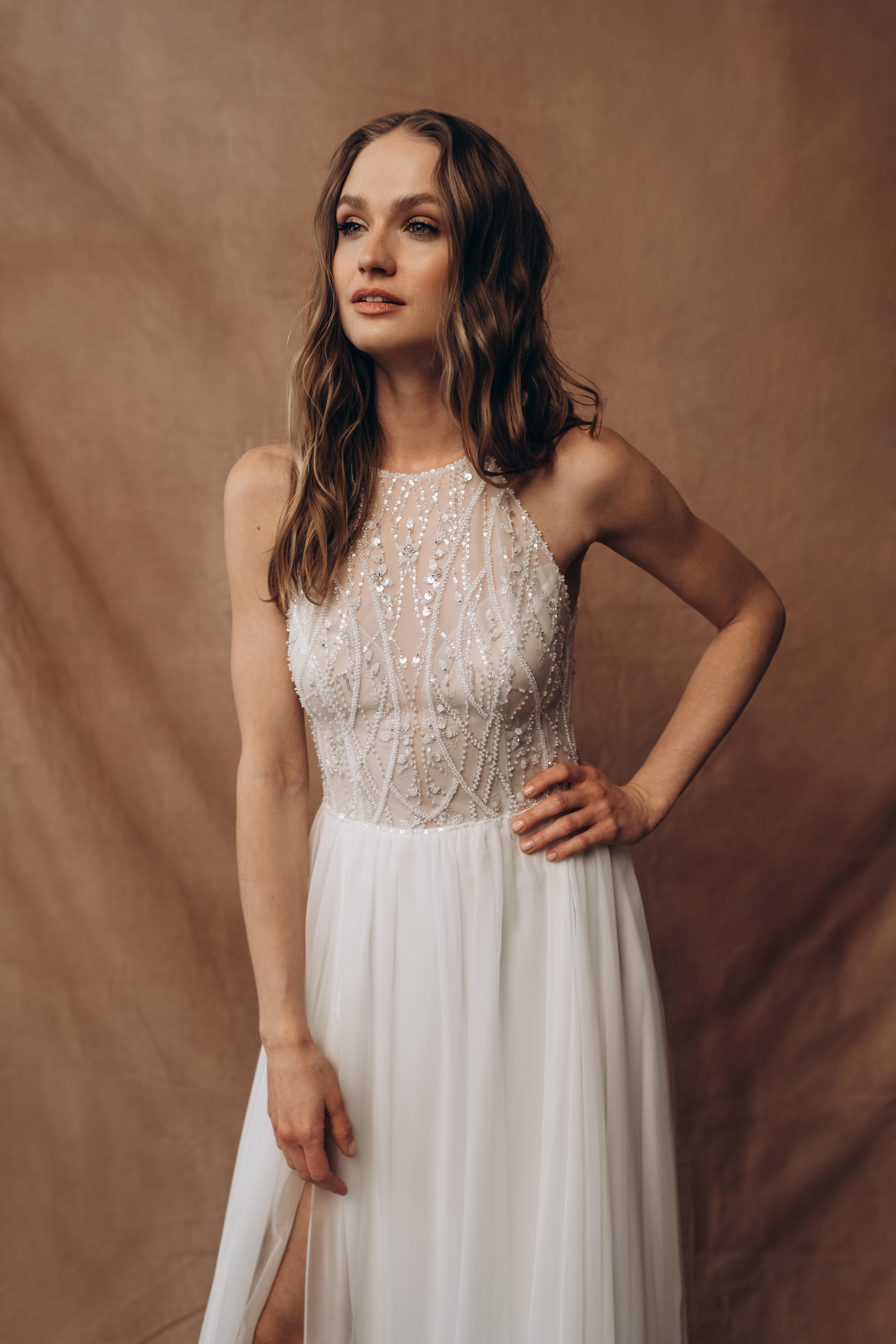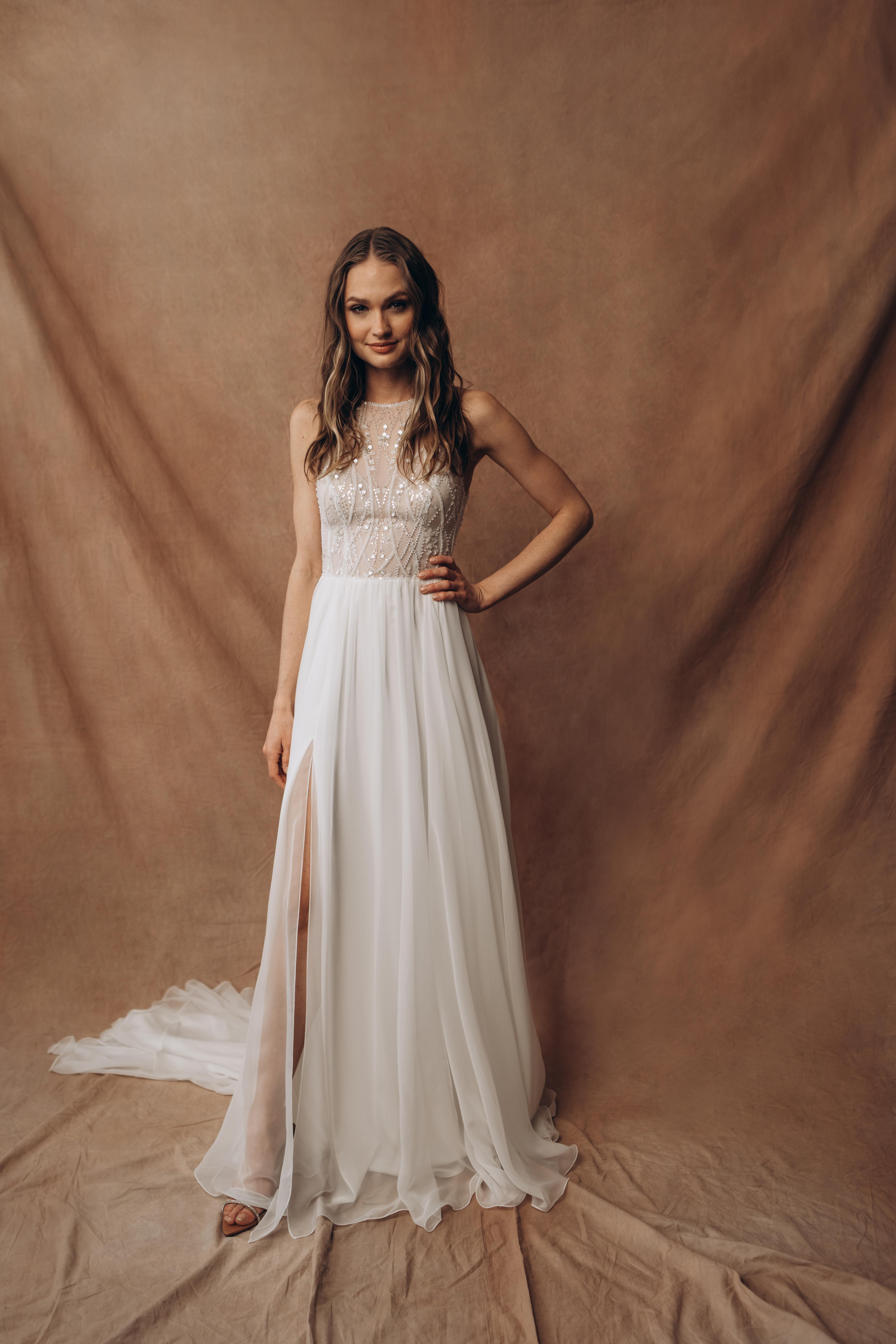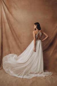 Sample Sale – Bodenlanges Brautkleid Bengali des Labels Todi Bride mit Pailletten und Perlen besticktem Spitzenoberteil sowie luftig-leichtem Chiffonrock. Ein absoluter Hingucker für deine Hochzeit!