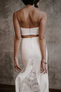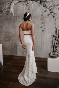 Der Brautrock Juniper besteht aus feinem Crepe in ivory mit kleiner Schleppe aus wunderschöner Spitze sowie einem mittigen Beinschlitz im Vorderteil. Der Schnitt ist figurnah, bietet aber noch genügend Bewegungsweite. Der Brautrock Juniper kann mit verschiedensten Brauttops kombiniert werden, so dass ein ganz besonderes Brautoutfit für die lässig-elegante Braut entsteht.