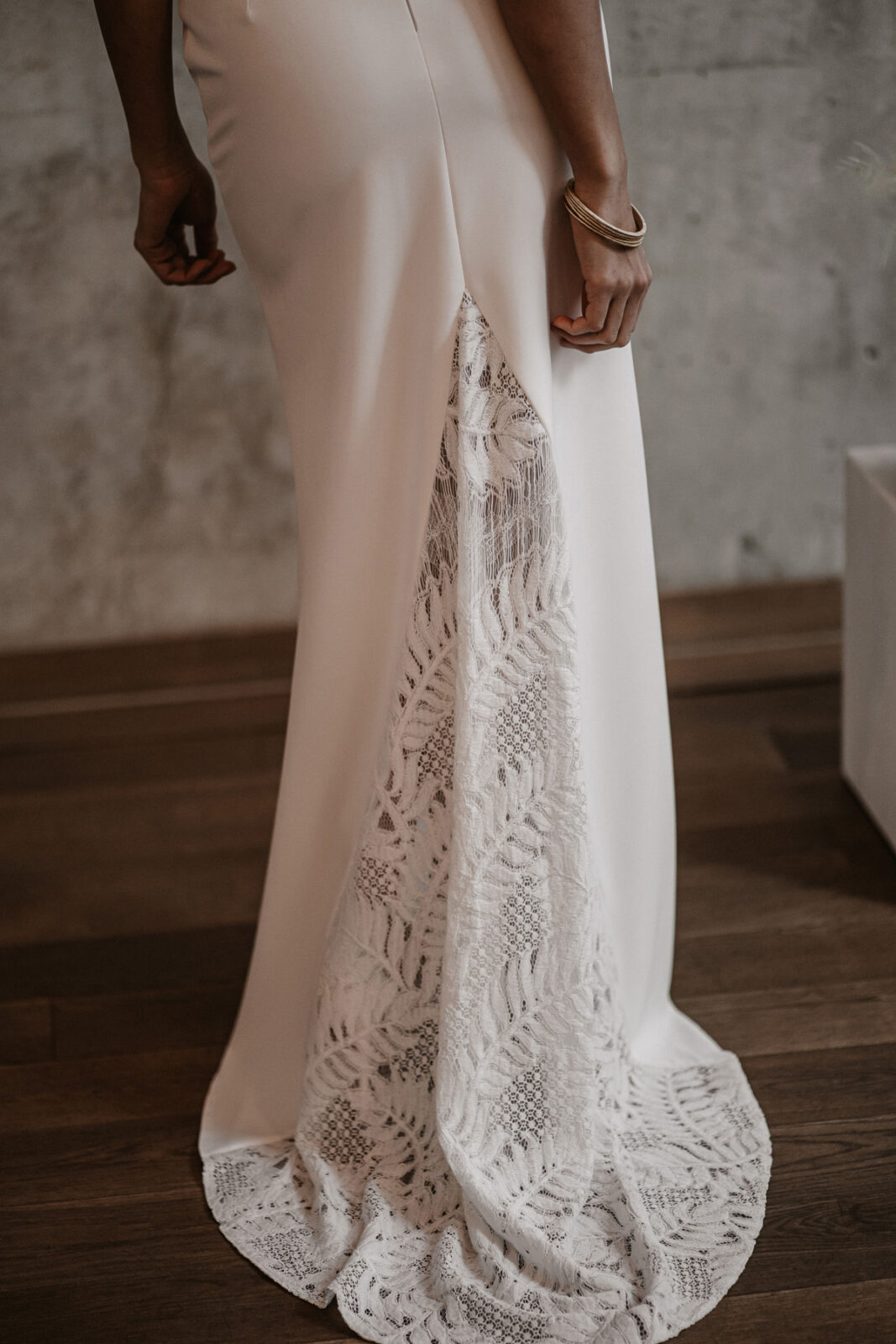 Der Brautrock Juniper besteht aus feinem Crepe in ivory mit kleiner Schleppe aus wunderschöner Spitze sowie einem mittigen Beinschlitz im Vorderteil. Der Schnitt ist figurnah, bietet aber noch genügend Bewegungsweite. Der Brautrock Juniper kann mit verschiedensten Brauttops kombiniert werden, so dass ein ganz besonderes Brautoutfit für die lässig-elegante Braut entsteht.