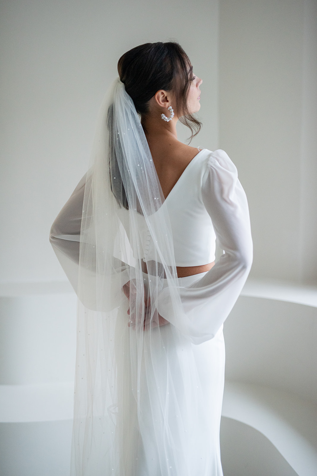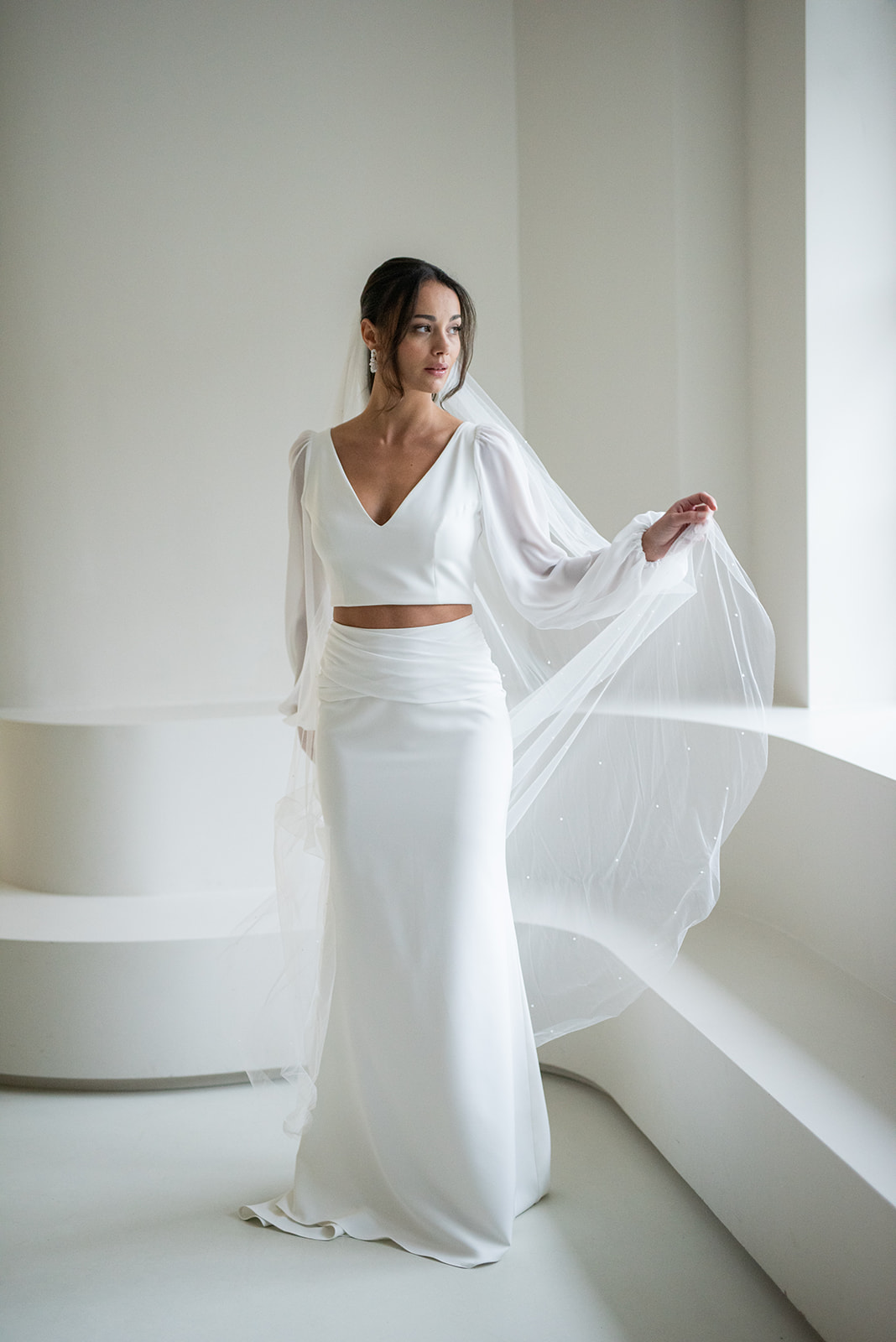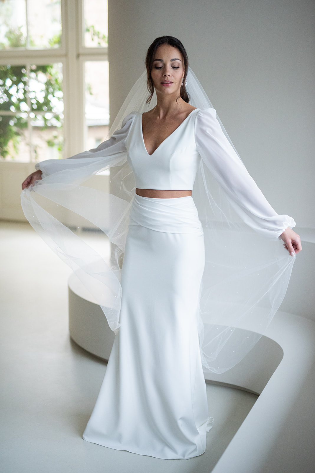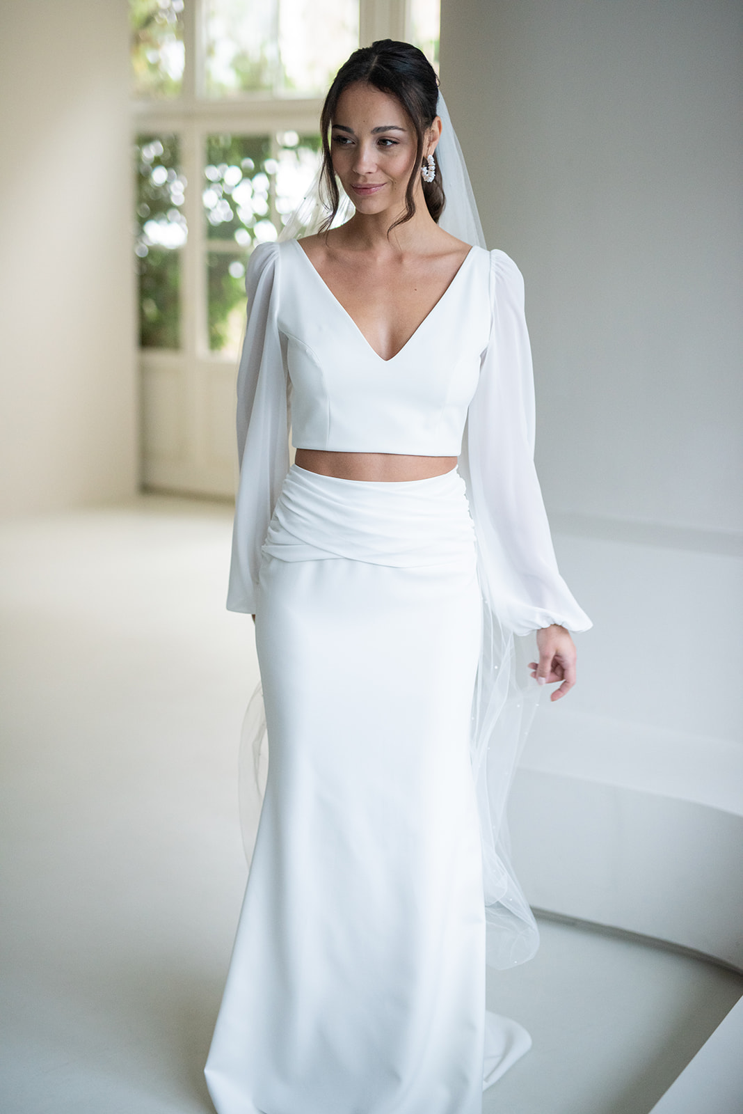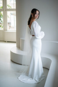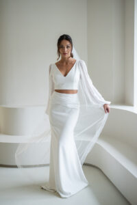 Unser tief ausgeschnittenes Brautoberteil Charlie mit zarten Chiffonärmeln ist ein cooles croptop für lässig- elegante Brautoutfits. Charlie kann nach dem Mix and Match-Prinzip zu den verschiedensten Brautröcken und Brauthosen kombiniert werden – für einen besonderen Look an der Hochzeit. Im Nachhaltigkeitsgedanken kann Charlie auch sehr schön noch nach der Hochzeit getragen werden – z.B. zu einer lässigen Highwaist Jeans.