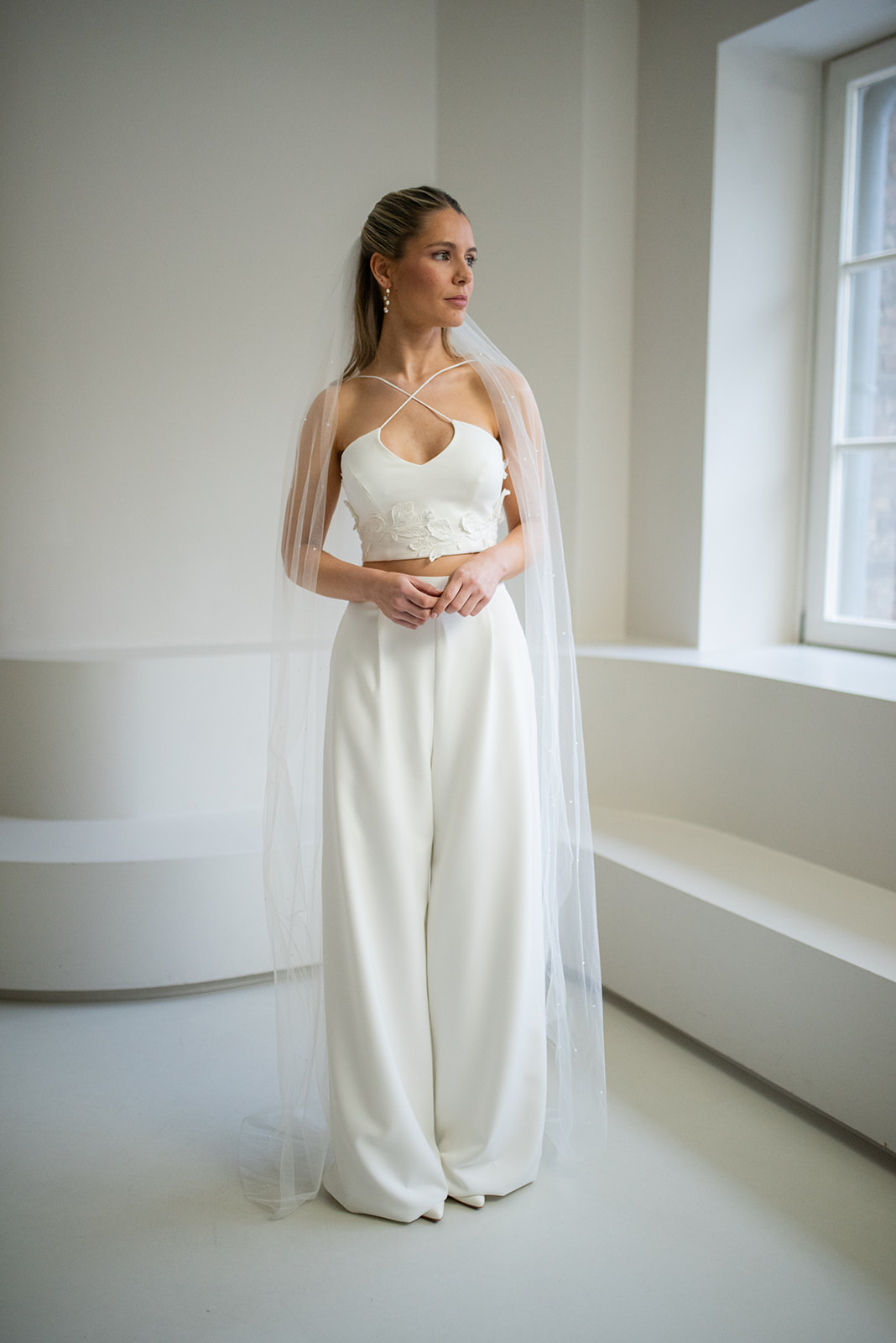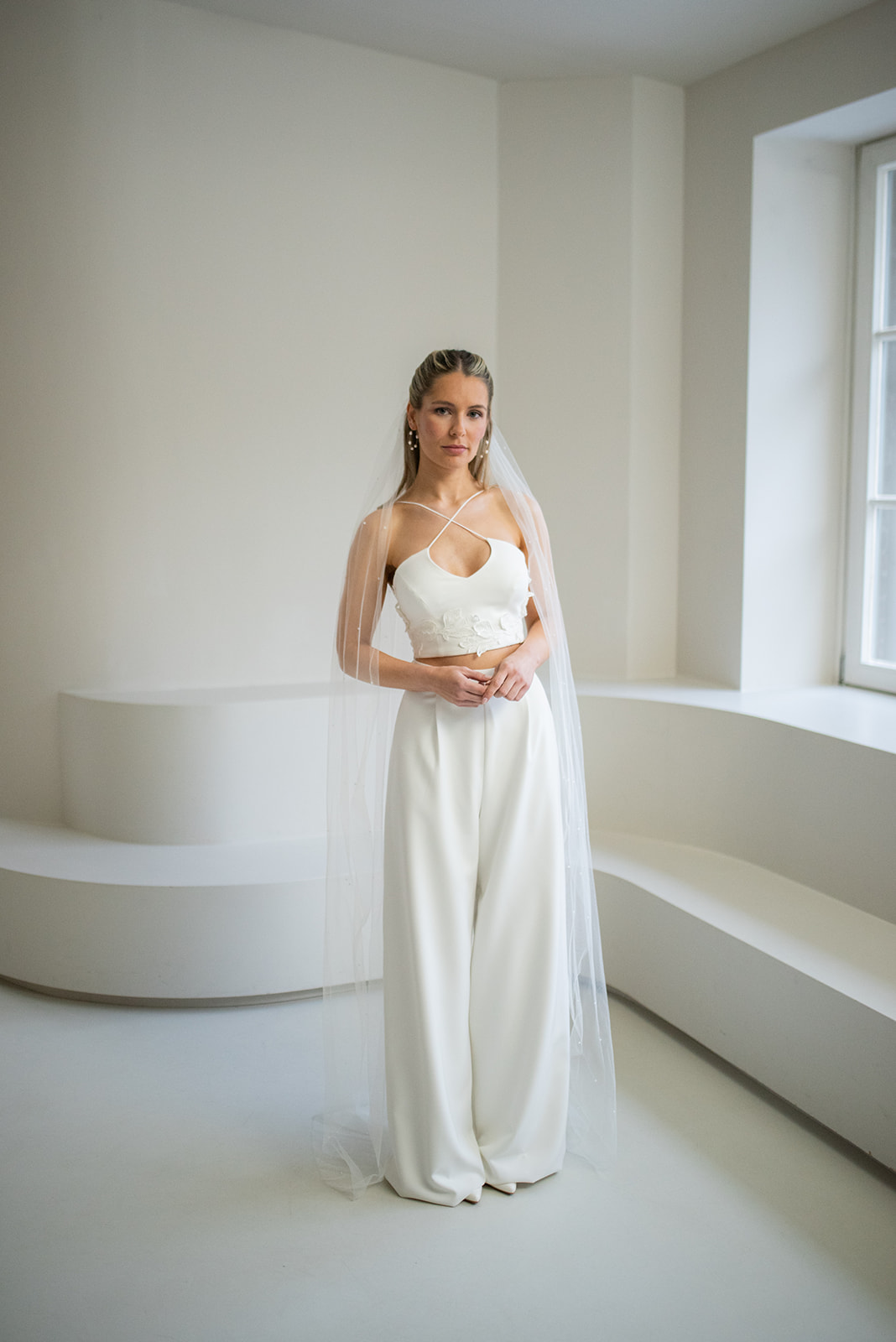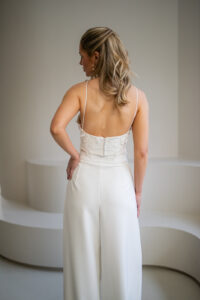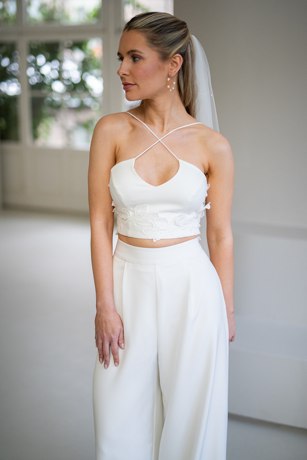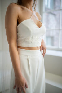 Unser wunderschönes Brauttop Virginie mit gekreuzten Trägern und zarten Blütenapplikationen ist ein cooles croptop für lässig- elegante Brautoutfits. Virginie kann zu den verschiedensten Brautröcken und Brauthosen kombiniert werden – für einen besonderen Look an der Hochzeit. Im Nachhaltigkeitsgedanken kann Virginie auch sehr schön noch nach der Hochzeit getragen werden – z.B. zu einer lässigen Highwaist Jeans.