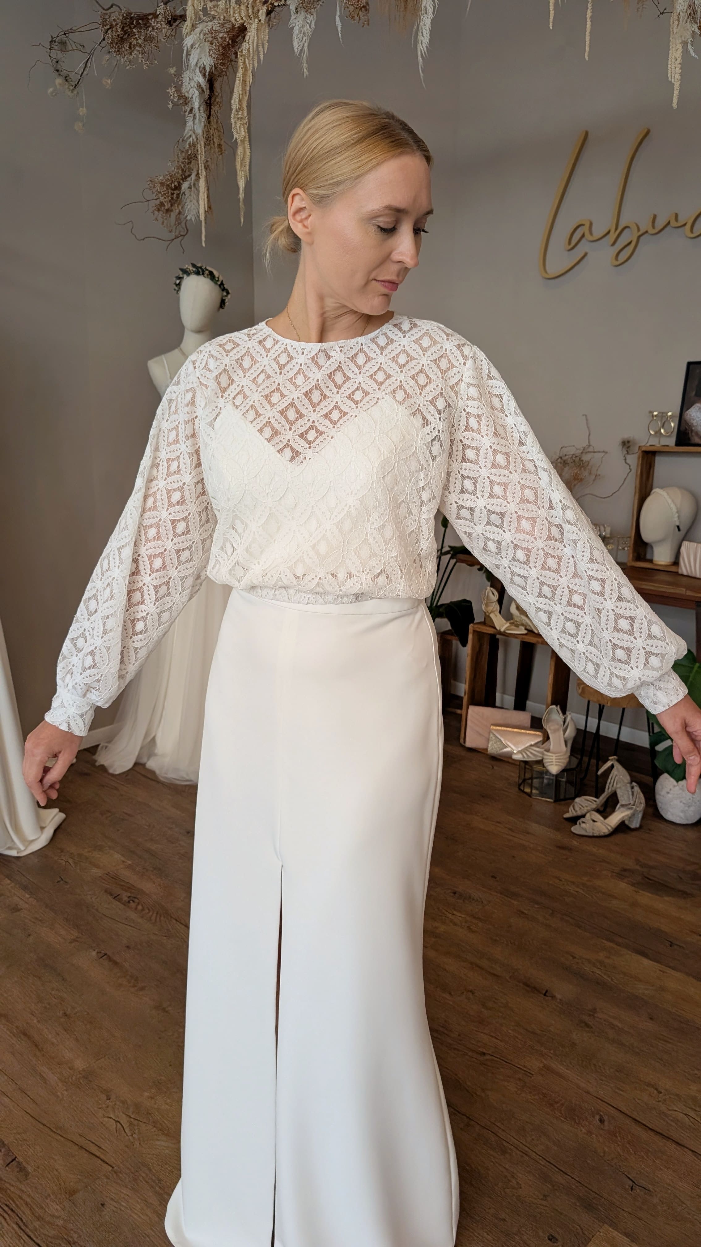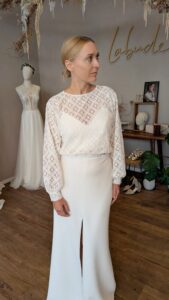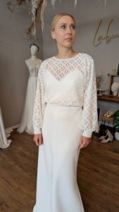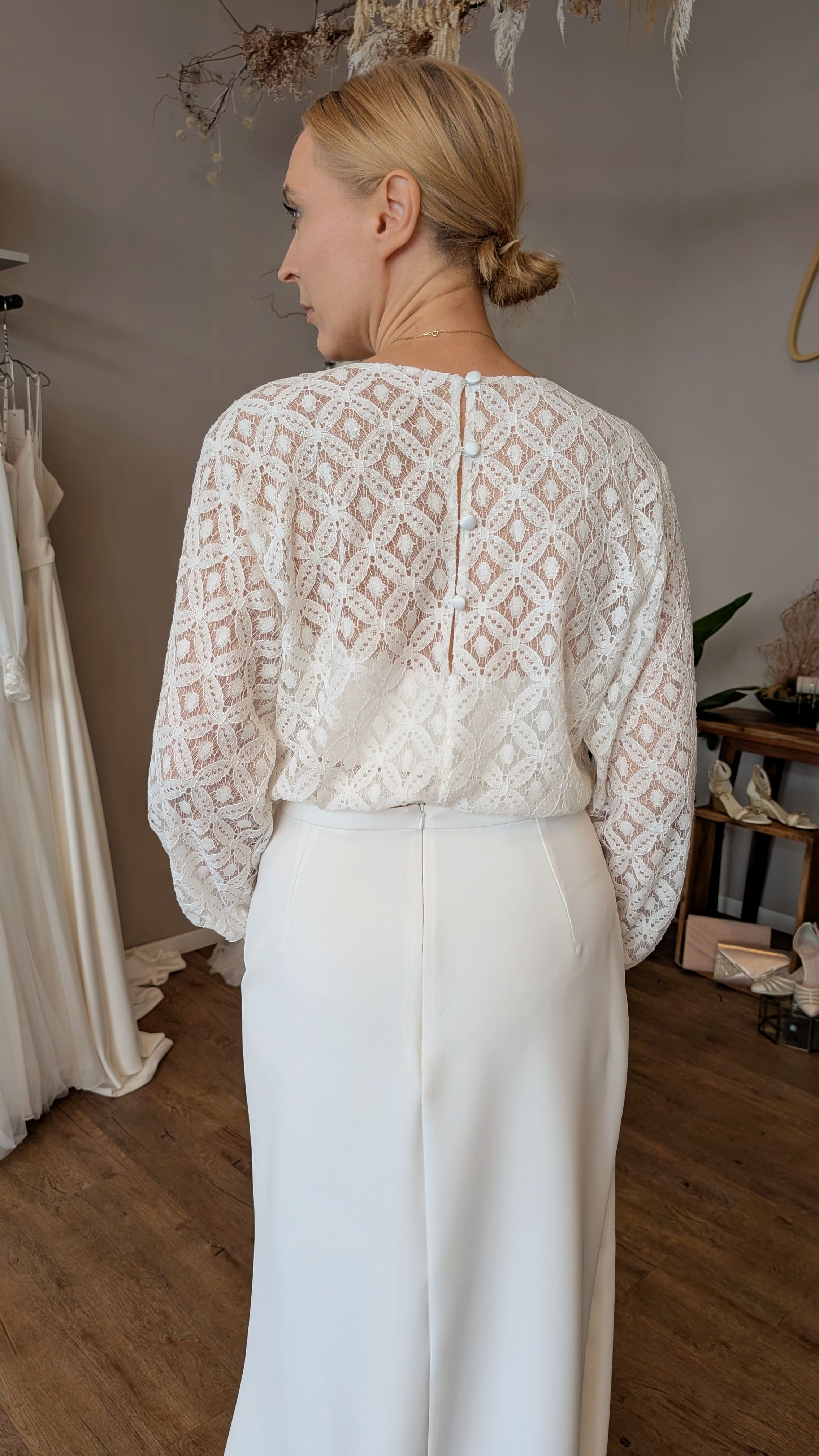 Unser Brauttopper Andie besteht aus strukturierter geometrischer Spitze in ivory und ist leicht durchscheinend. Der lockere „oversized“ Schnitt mit langen Ärmeln sorgt für einen lässig- eleganten Style am Hochzeitstag. Andie kann über verschiedenste Brautkleider und schlichte Tops kombiniert werden (abgebildet über unserem Top Nova) – für ein besonderes Brautoutfit!