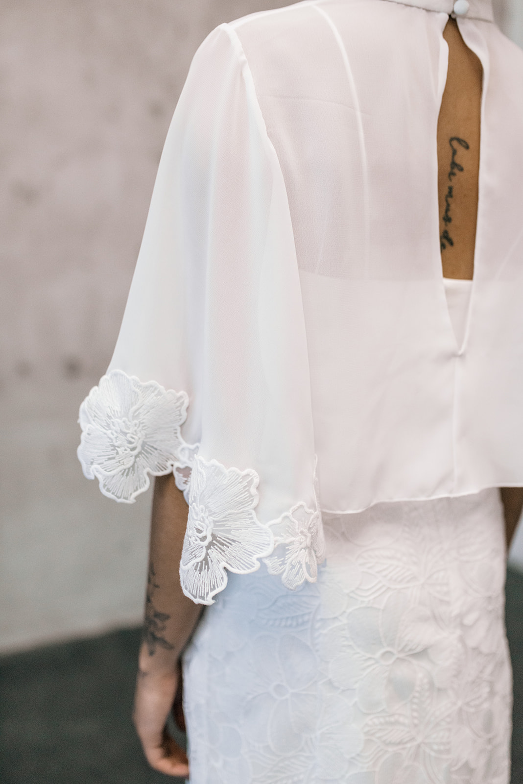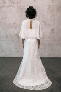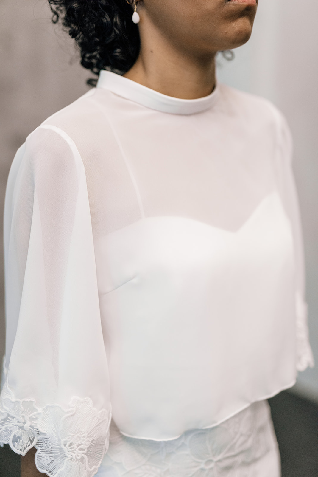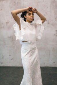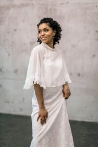 Sample Sale – Unser eleganter Braut Topper Aurelie mit Stehkragen und weiten Ärmeln ist ein cooler topper für lässig- elegante Brautoutfits. Der transparente Topper Aurelie kann als wunderschönes Brautoberteil zu den verschiedensten Brautröcken kombiniert werden, so dass einzigartige Zweiteiler Kombinationen im Mix and Match Stil entstehen. Im Nachhaltigkeitsgedanken kann Aurelie auch sehr schön noch nach der Hochzeit getragen werden – z.B. zu einer lässigen highwaist Jeans.
