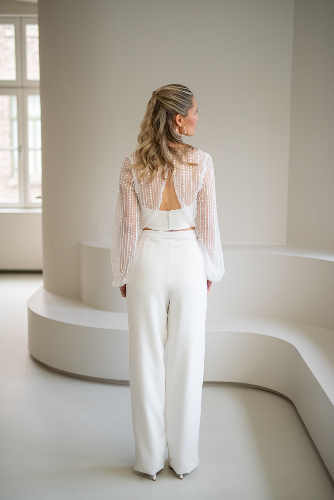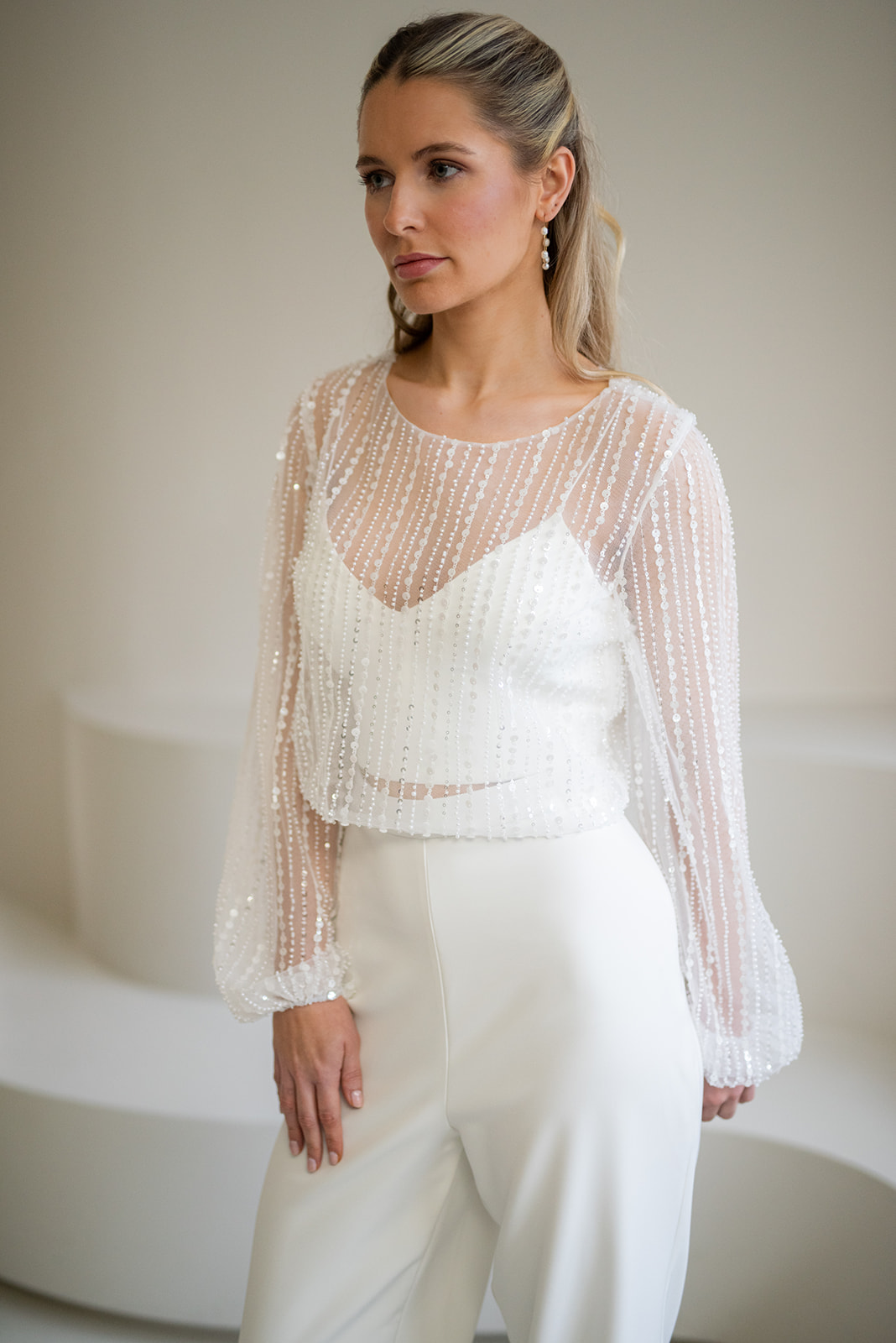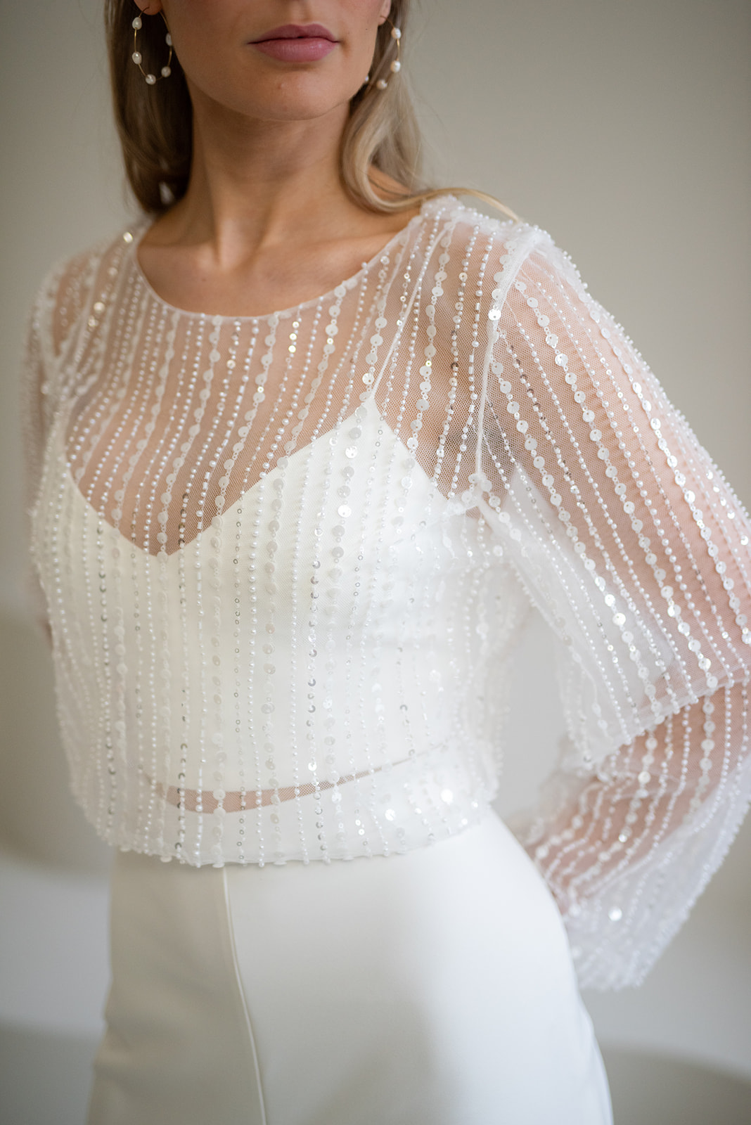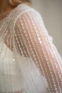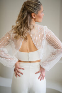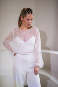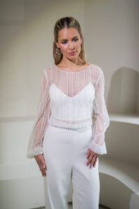 Unser hochgeschlossener, transparenter Braut Topper Bella mit langen Ärmeln besteht aus einem mit Perlen und Pailletten bestickten Softtüll und hat einen eleganten Schnitt. Bella kann nach dem Mix and Match-Prinzip zu den verschiedensten Brautröcken und Brauthosen aber auch über verschiedene Brautkleider kombiniert werden – für einen besonderen Look an der Hochzeit. Im Nachhaltigkeitsgedanken kann Bella auch sehr schön noch nach der Hochzeit getragen werden – z.B. zu einer lässigen Highwaist Jeans.
