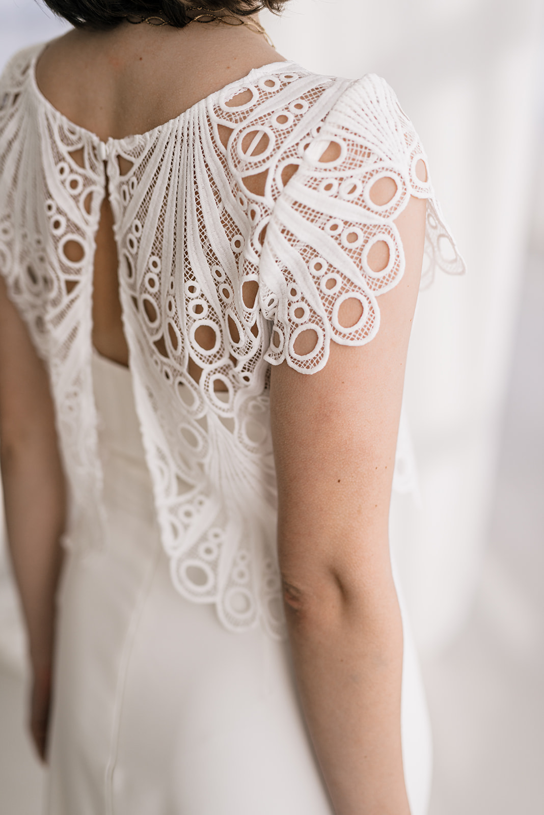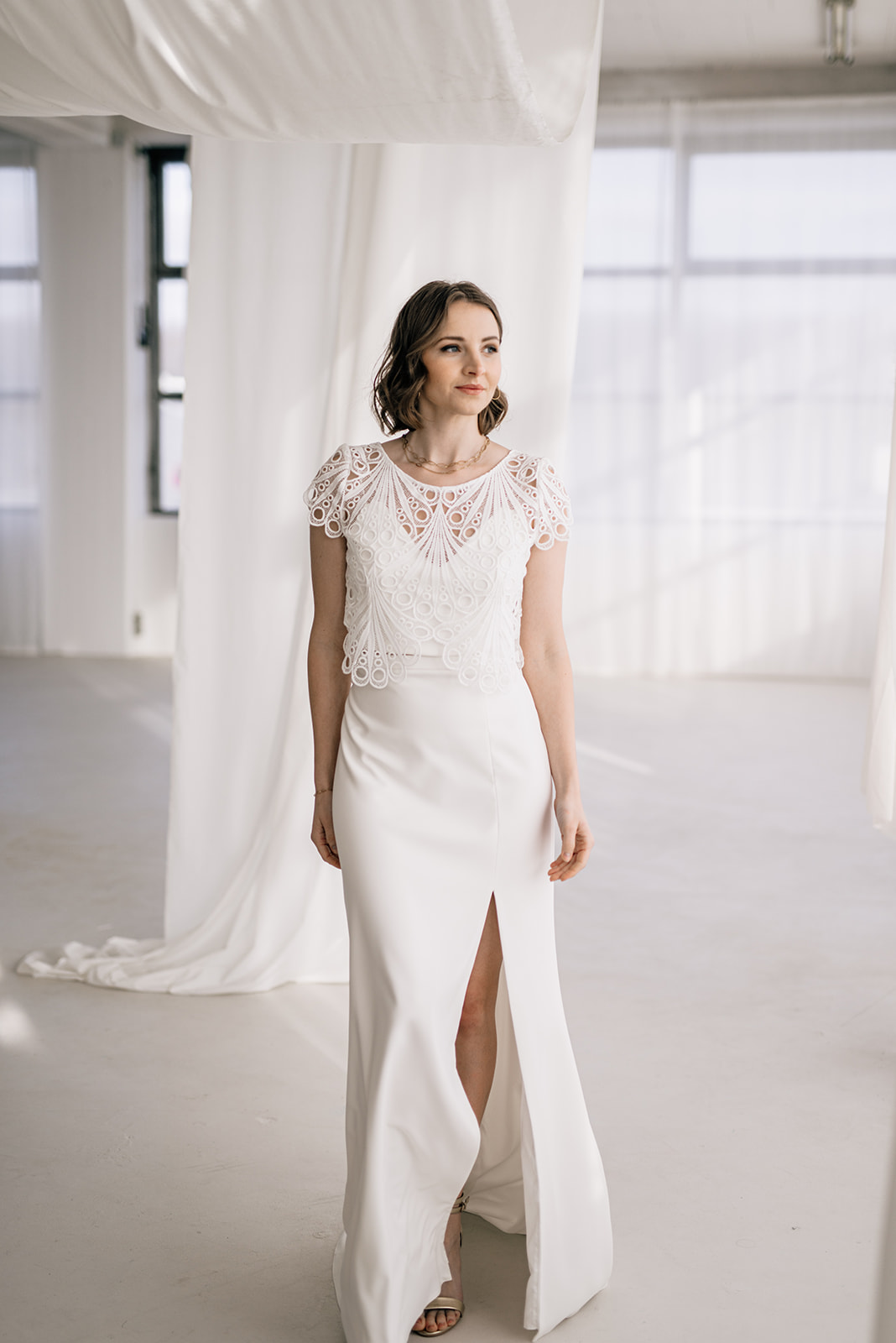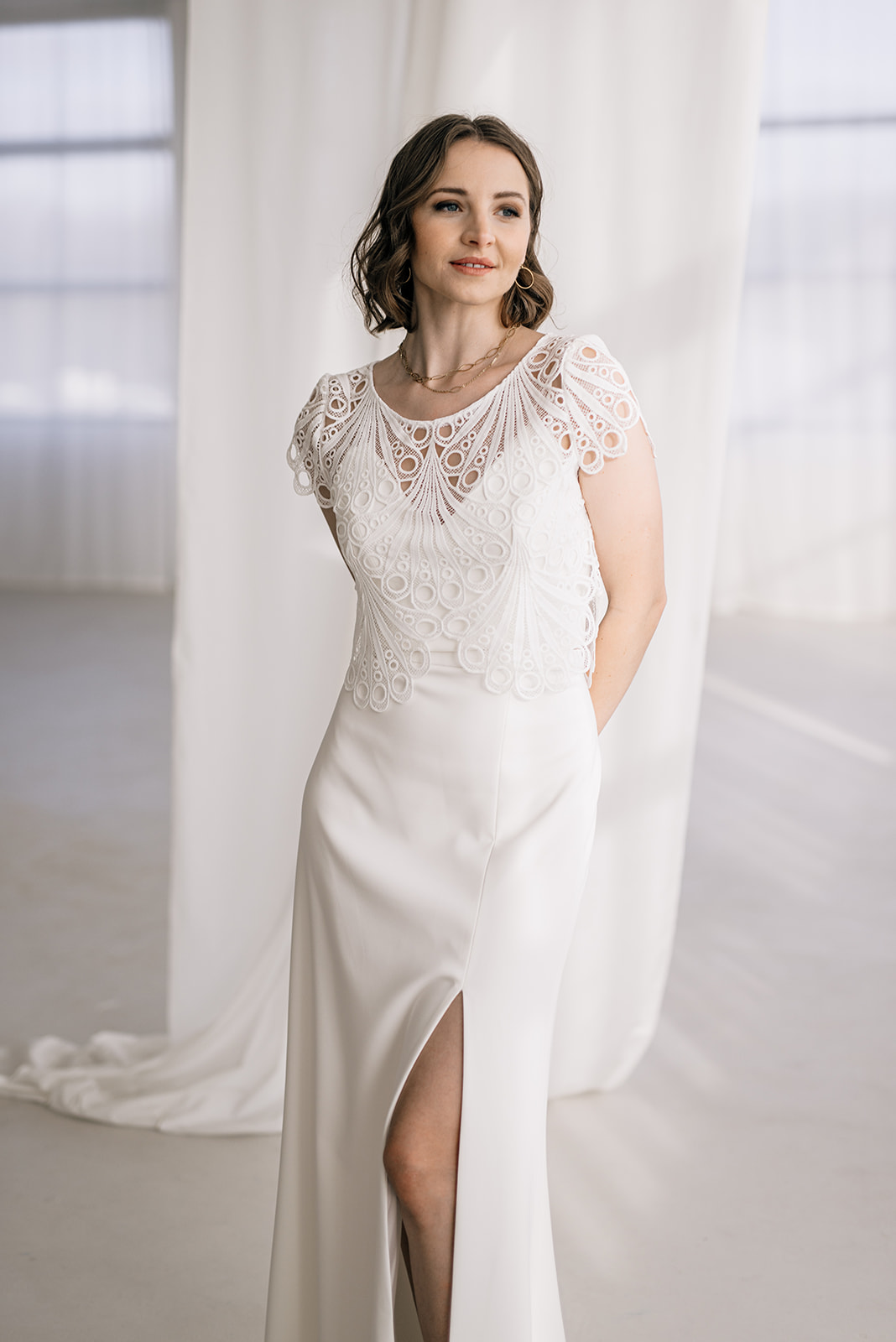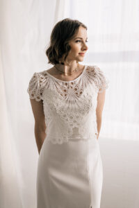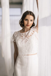 Sample Sale – Unser eleganter Braut Topper Juno aus Spitze mit besonderer Bogenkante ist ein cooler topper für lässig- elegante Brautoutfits. Der transparente Topper Juno kann als wunderschönes Brautoberteil zu den verschiedensten Brautröcken kombiniert werden, so dass einzigartige Zweiteiler Kombinationen im Mix and Match Stil entstehen. Im Nachhaltigkeitsgedanken kann Juno auch sehr schön noch nach der Hochzeit getragen werden – z.B. zu einer lässigen highwaist Jeans.