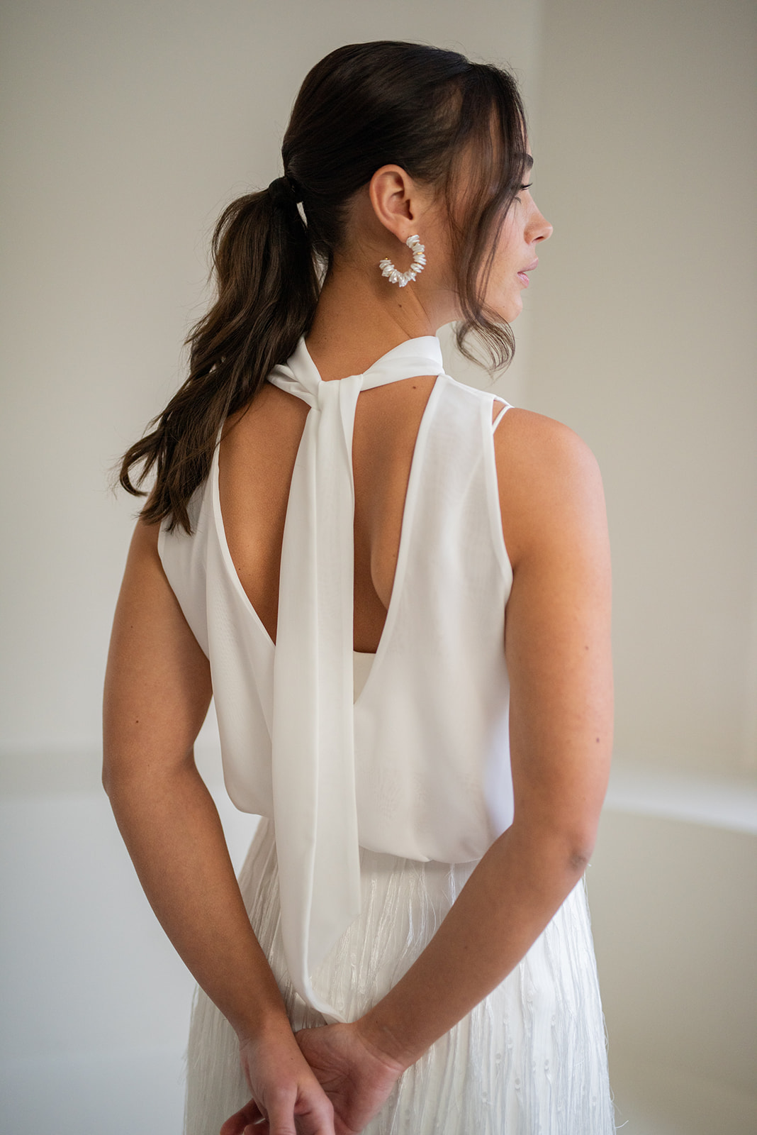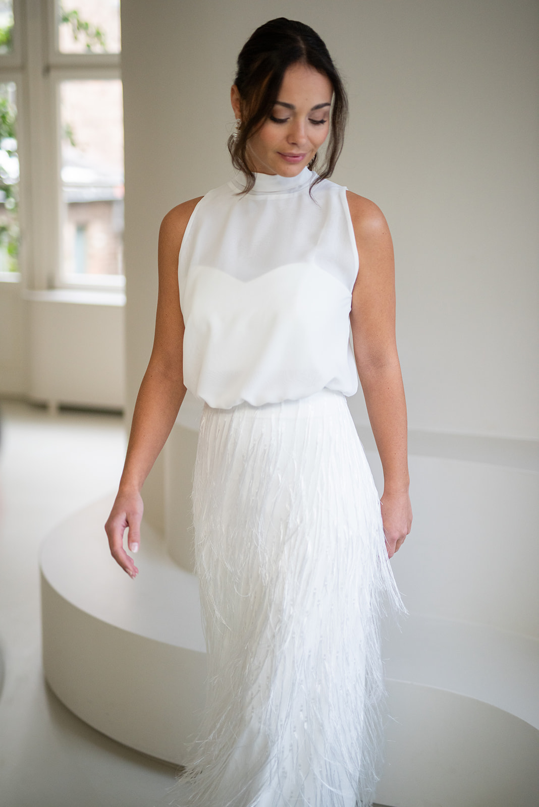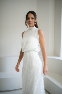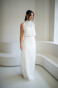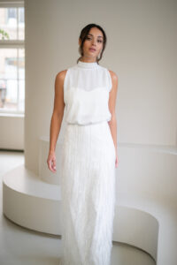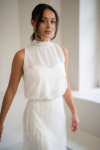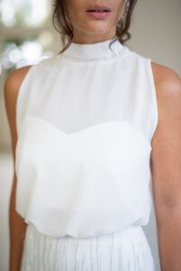Unser hochgeschlossener, transparenter Braut Topper Sibyll besteht aus zartem Chiffon mit einem eleganten Stehkragen der im Rücken gebunden wird. Sibyll kann nach dem Mix and Match-Prinzip zu den verschiedensten Brautröcken und Brauthosen aber auch über verschiedene Brautkleider kombiniert werden – für einen besonderen Look an der Hochzeit. Im Nachhaltigkeitsgedanken kann Sibyll auch sehr schön noch nach der Hochzeit getragen werden – z.B. zu einer lässigen Highwaist Jeans.