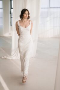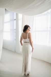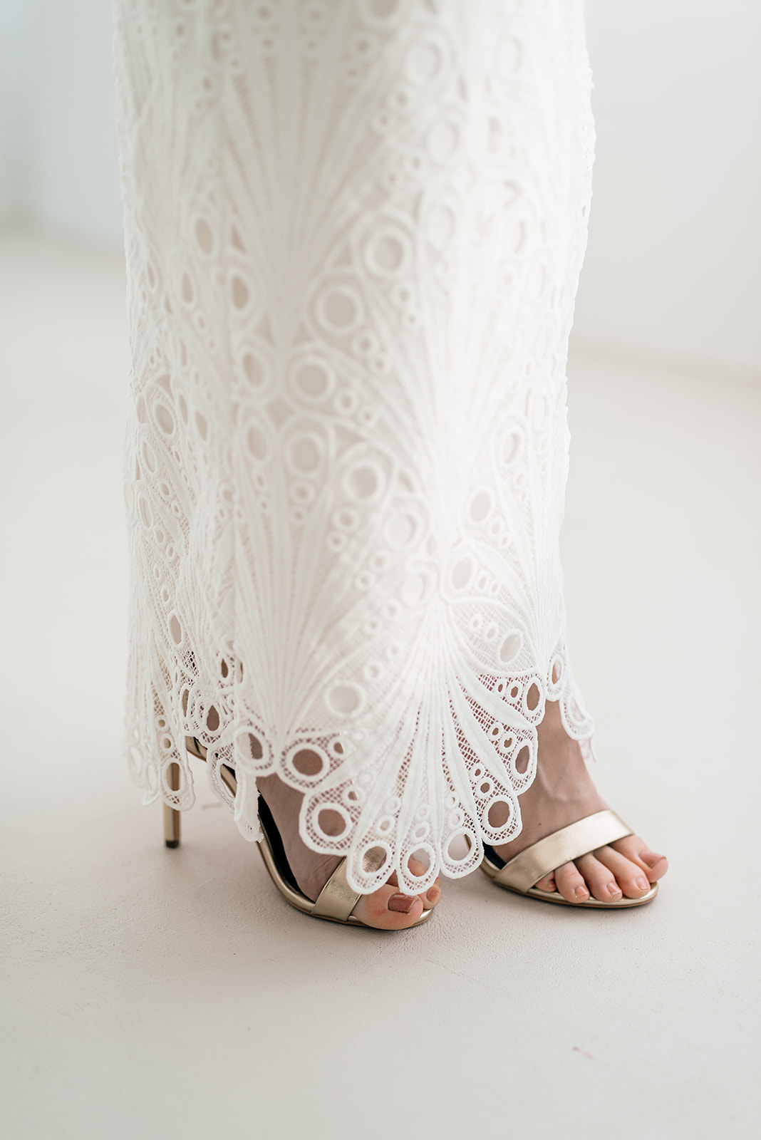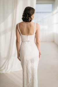 Sample Sale – Schmaler, knöchellanger Brautrock Selma aus Spitze. Selma sitzt figurbetont und hat eine wunderschöne Bogenkante am Saum. Er ist in ivory und kann perfekt zu verschiedenen Oberteilen – auch nach der Hochzeit – kombiniert werden.